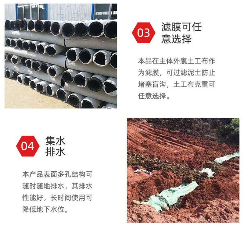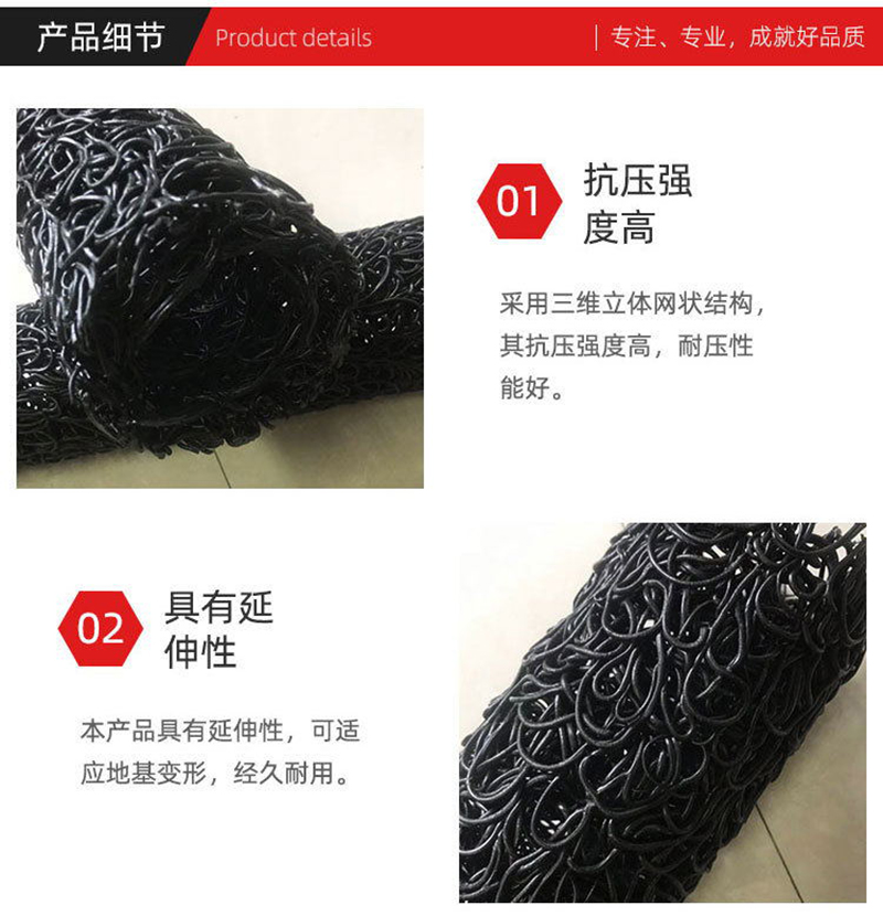 2、由于是立體結(jié)構(gòu),其空隙率為80-95%,構(gòu)成空間與管理同且輕便,抗壓性能比管結(jié)構(gòu)的樹(shù)脂強(qiáng)10倍以上,因此,即使因超負(fù)荷被壓,但由于是立體結(jié)構(gòu),故殘余空隙也達(dá)50%以上,不存在不通水的問(wèn)題,無(wú)需考慮會(huì)被土壓力壓壞。